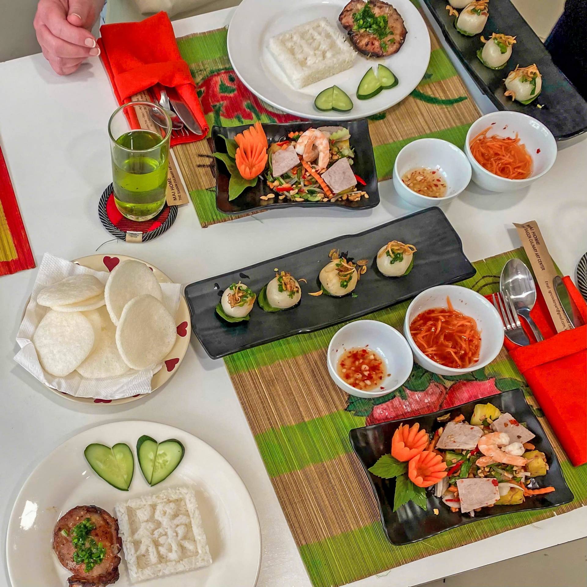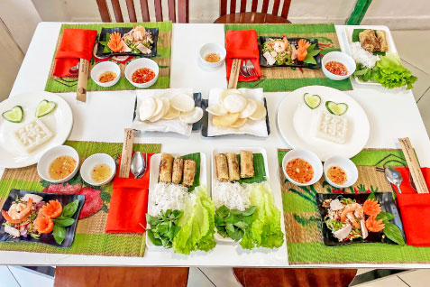 | 1 | Spring rolls | Lotus stems salad with pork and prawn | Dumpling with spring onion sauce | Beef salad with star fruit and young banana | Mango salad with pork and shrimp | Salad rolls |