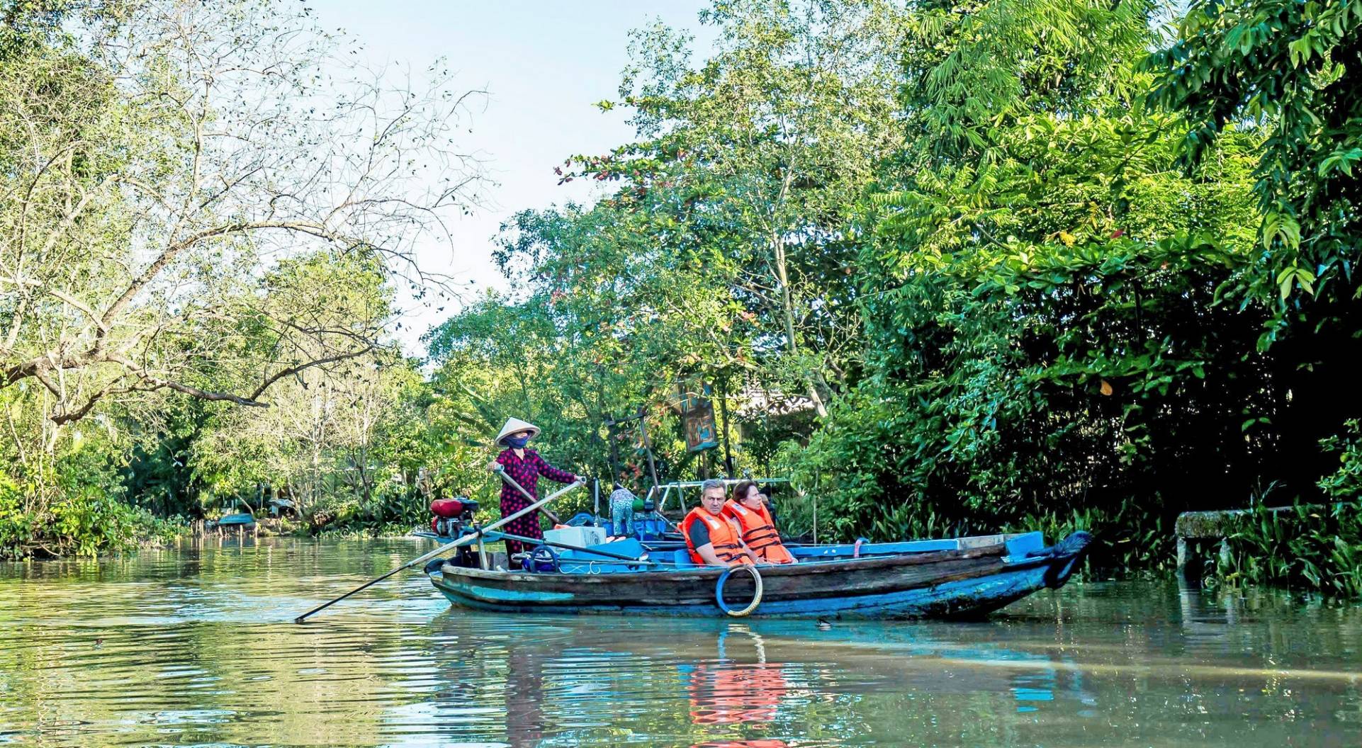 Your guide and driver will pick you up for a 2-hour drive to Ben Tre, with a short stop along the way. On arrival, board a motorboat to cruise the canals and see life unfold on the river. Stop at a brick kiln, visit workshops making coconut candy and woven mats, and meet local families over tea and fruit. Drift along shady canals on a hand-rowed sampan before cycling or taking a motor cart through peaceful village roads.